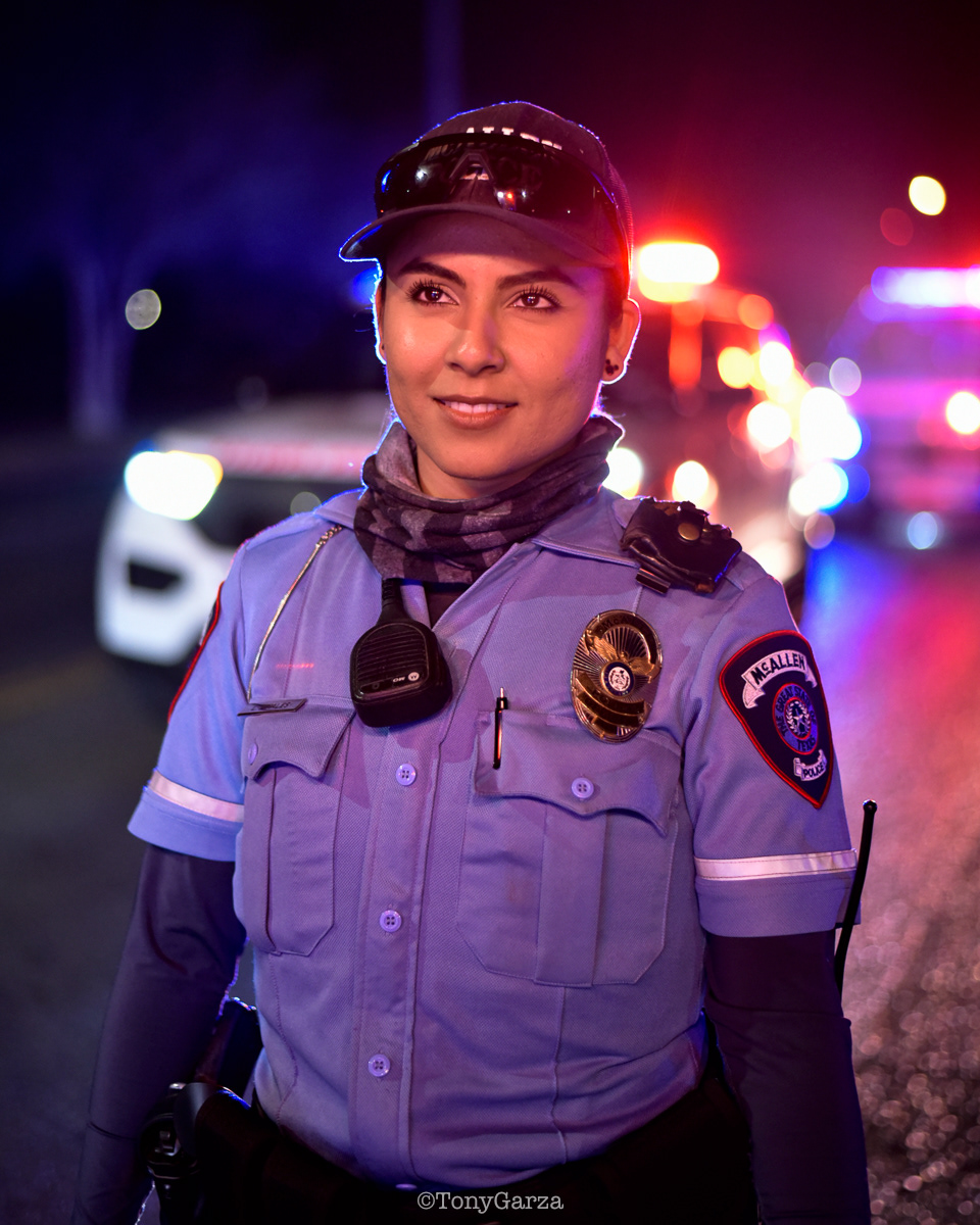 The composition centers her perfectly against the blurred background of emergency lights and vehicles, which keeps the focus right on her expression and presence. Credit to ©Tony Garza (who seems to be a local documentary photographer in the area, often capturing first responders and community stories) for nailing the balance between grit and approachability.