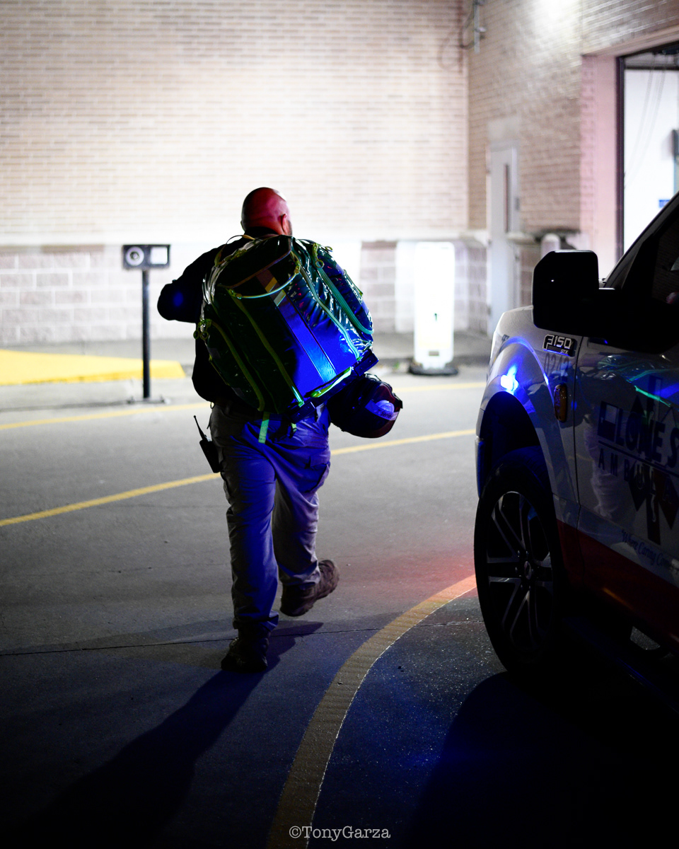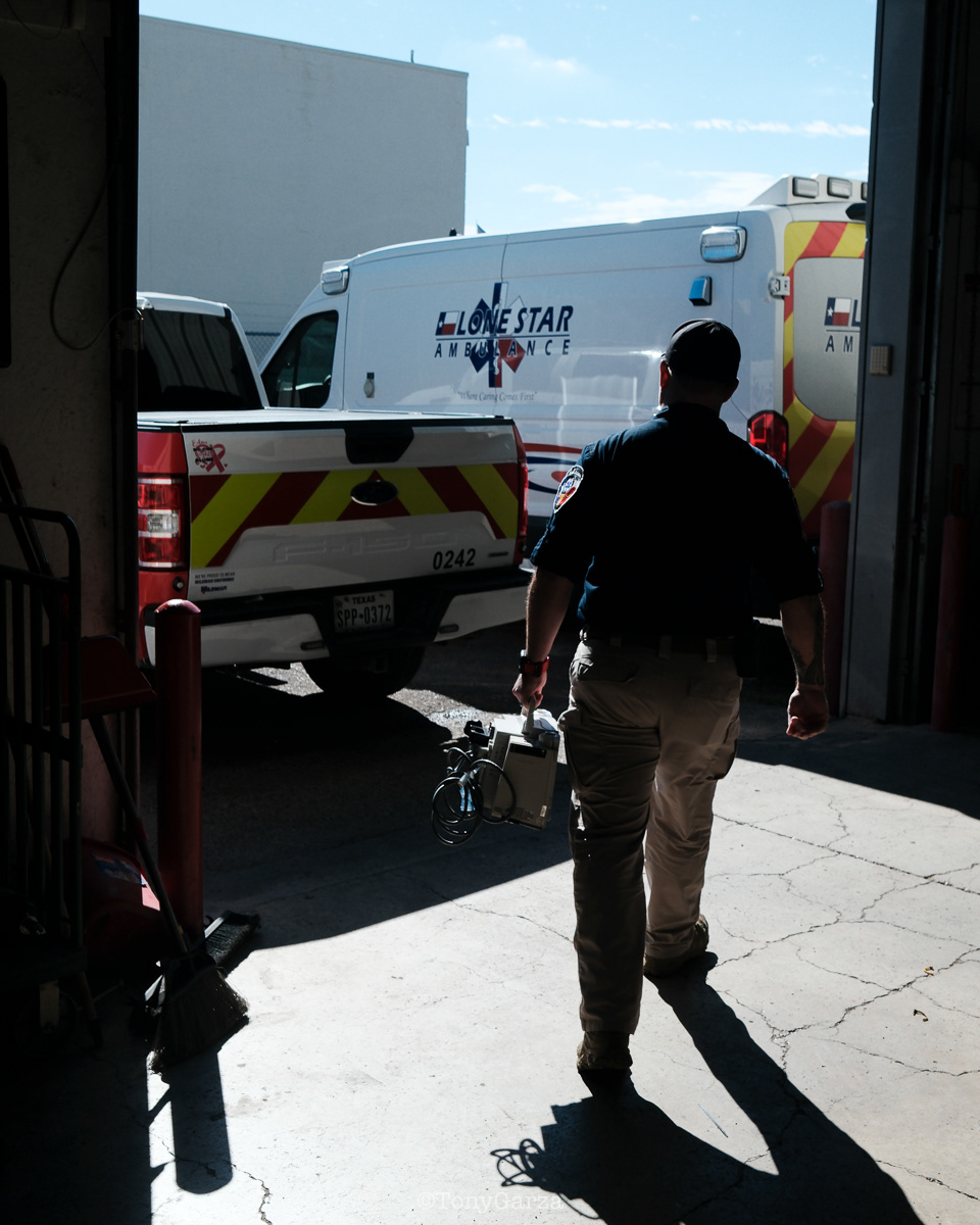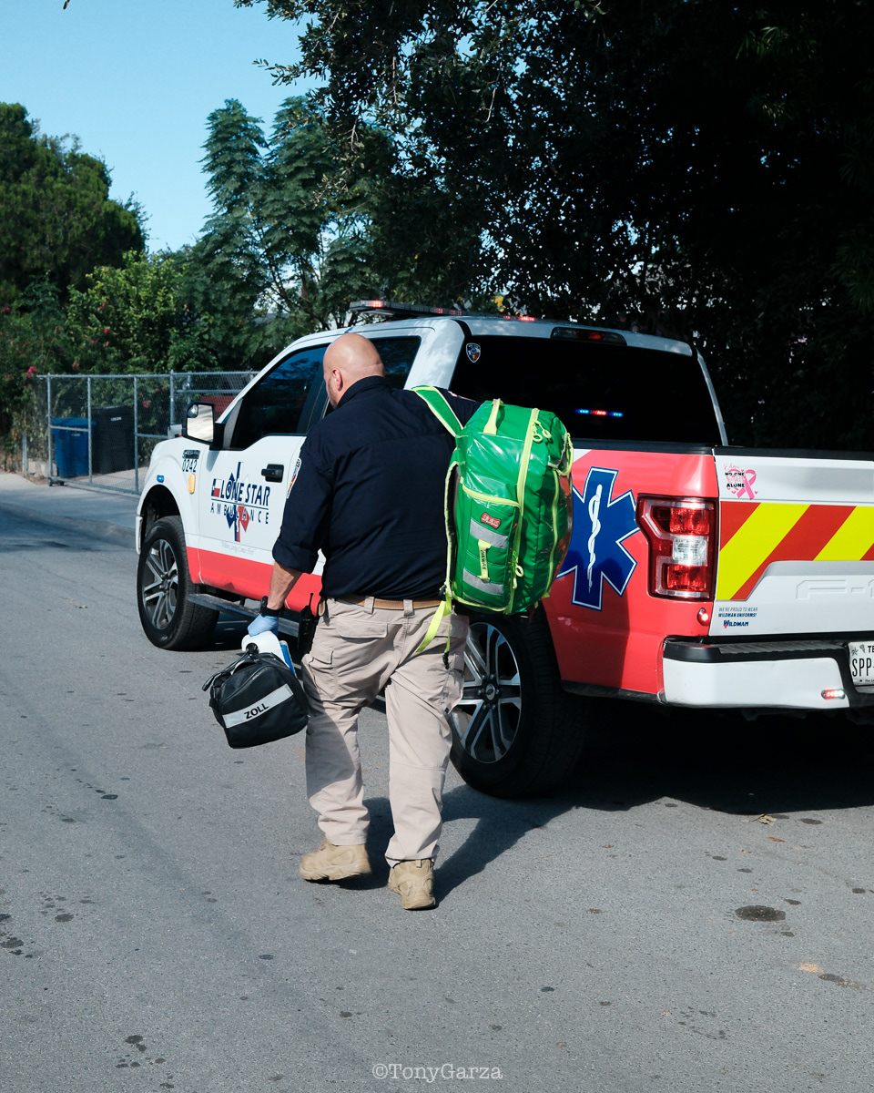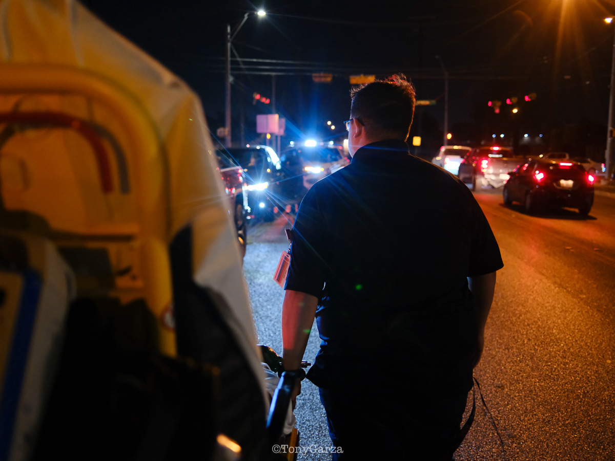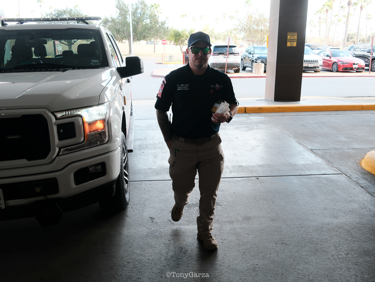 (Pictured: Supervisor/Paramedic O. Espinoza, with over 20 years of service, walking in and out from emergencies.)