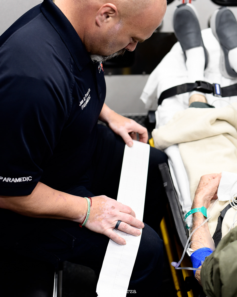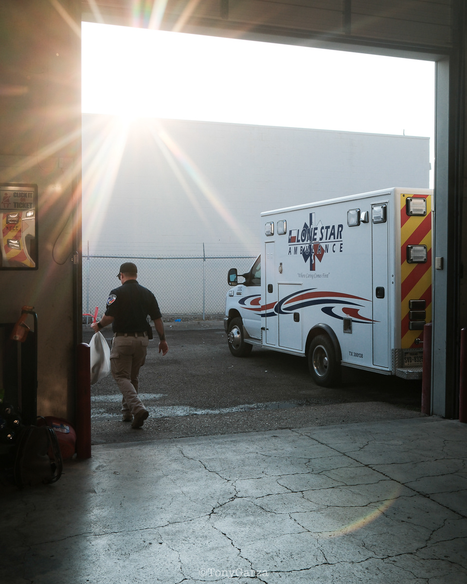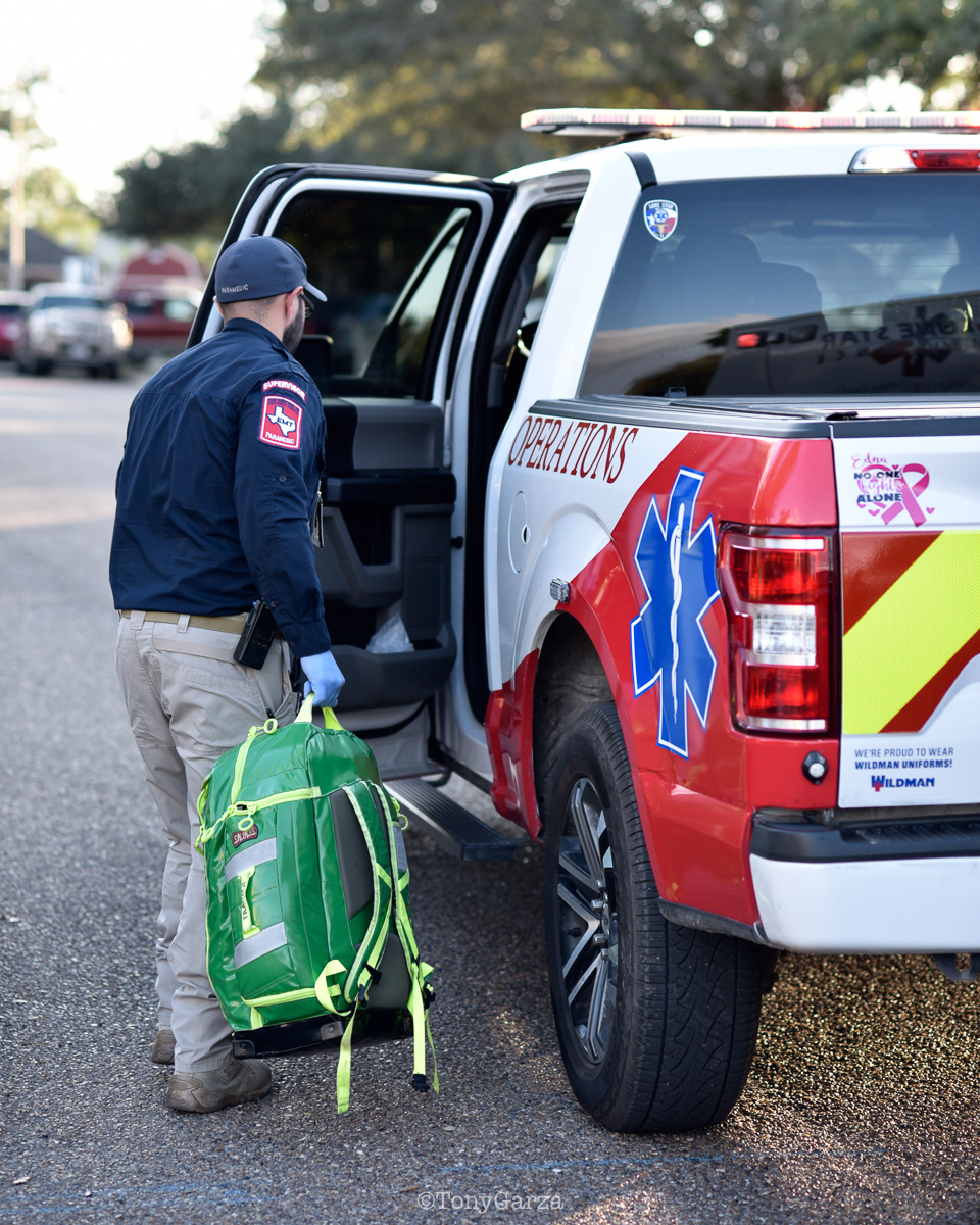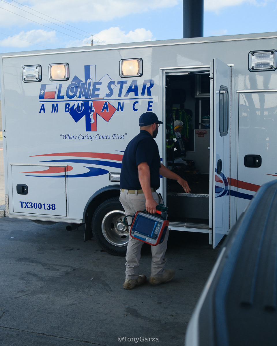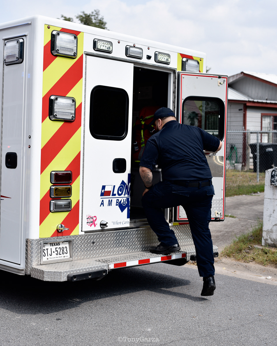 (Pictured: Supervisor/Paramedic O. Espinoza, with over 20 years of service, walking in and out from emergencies.)