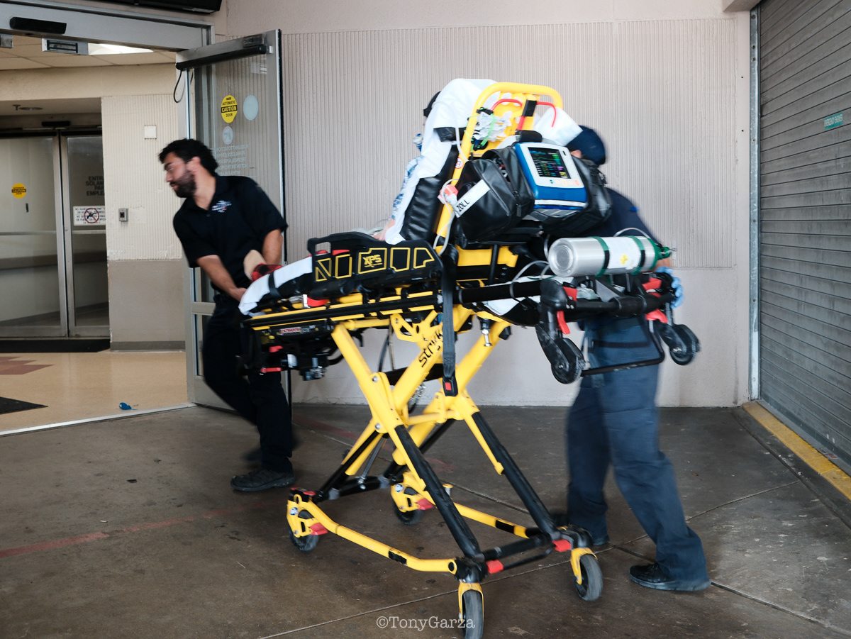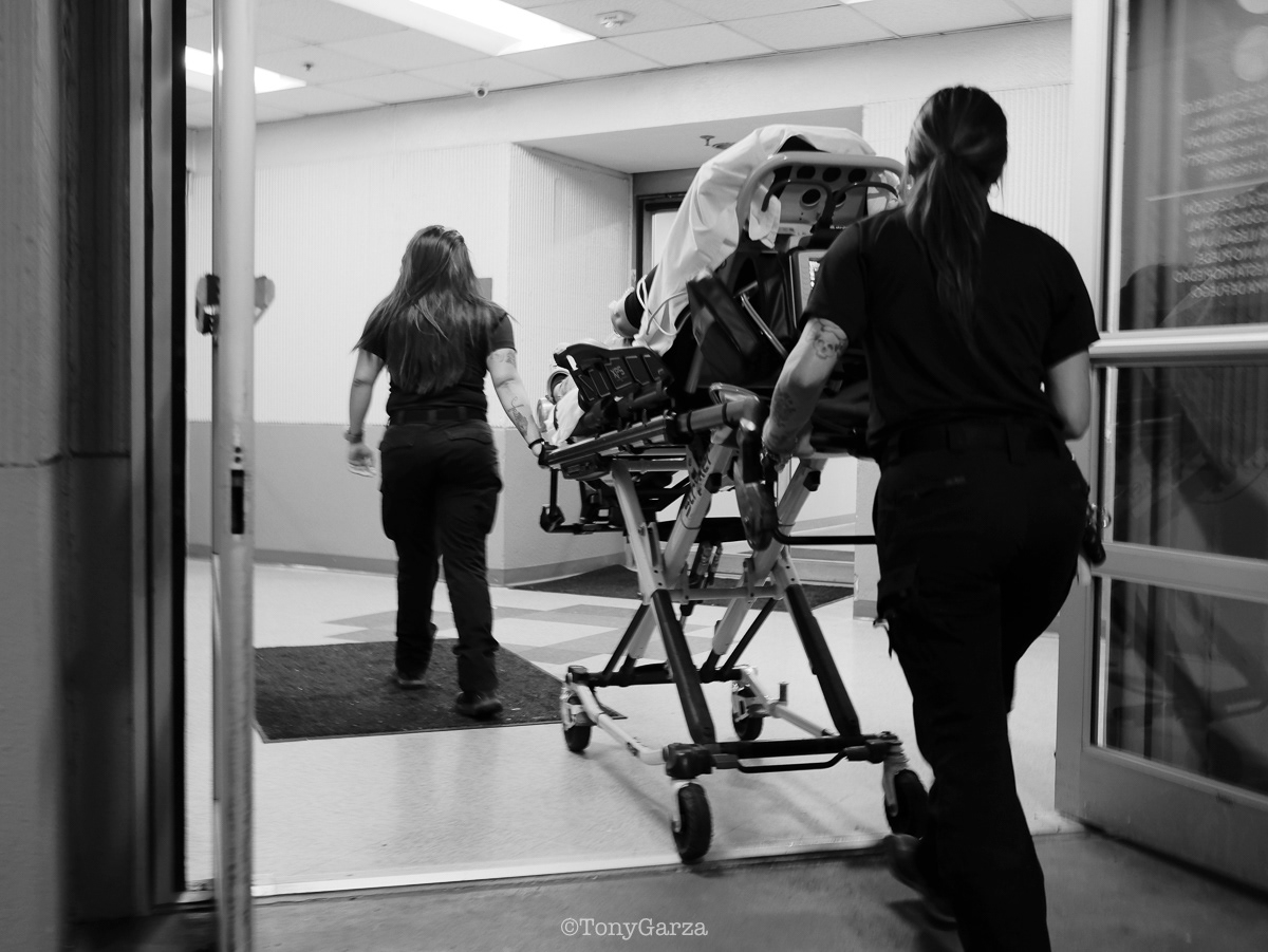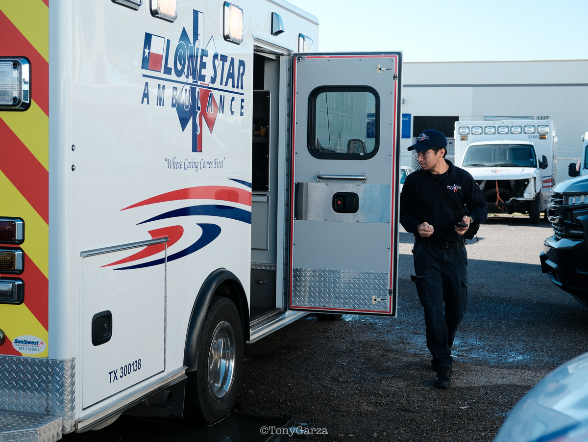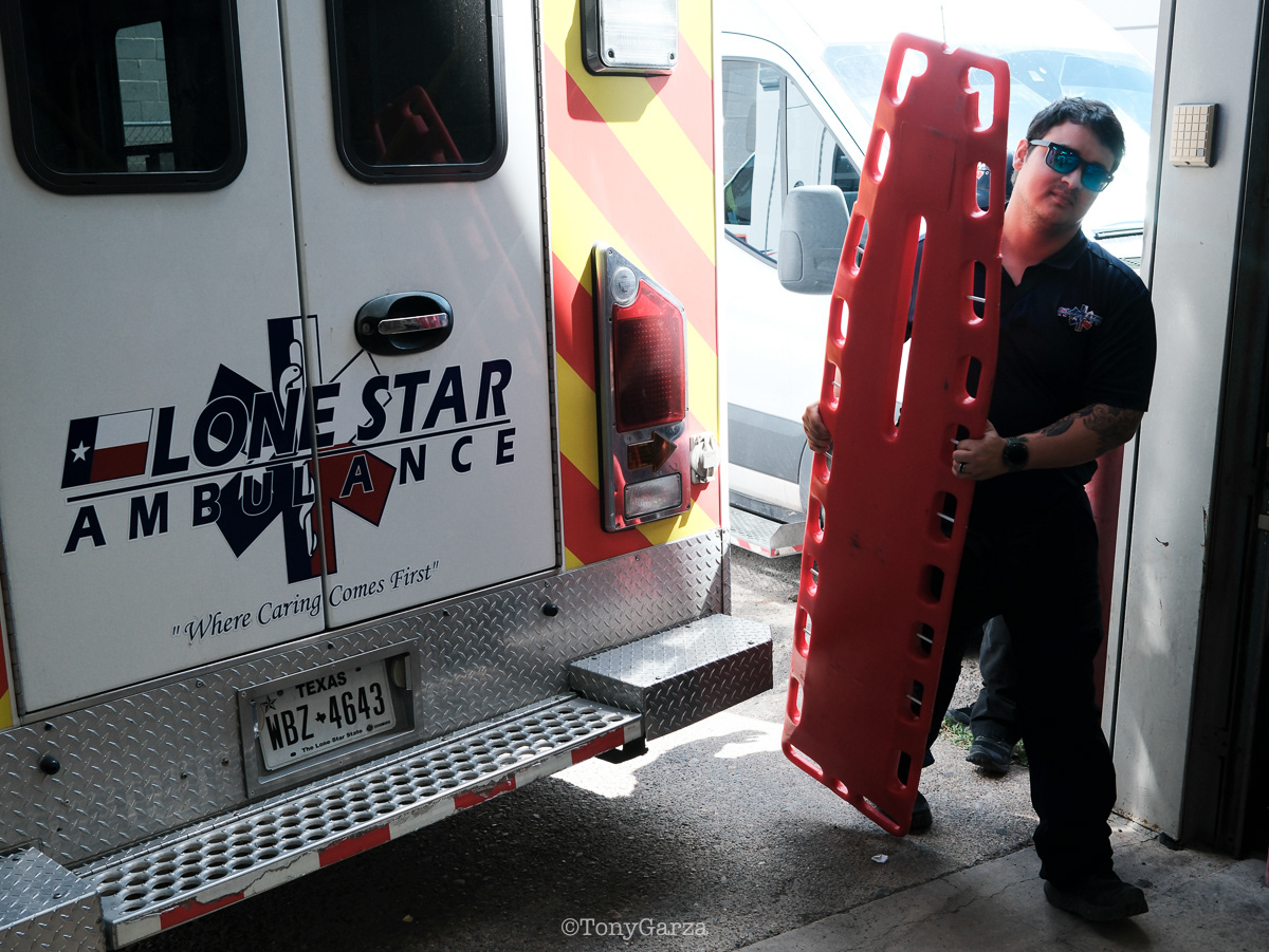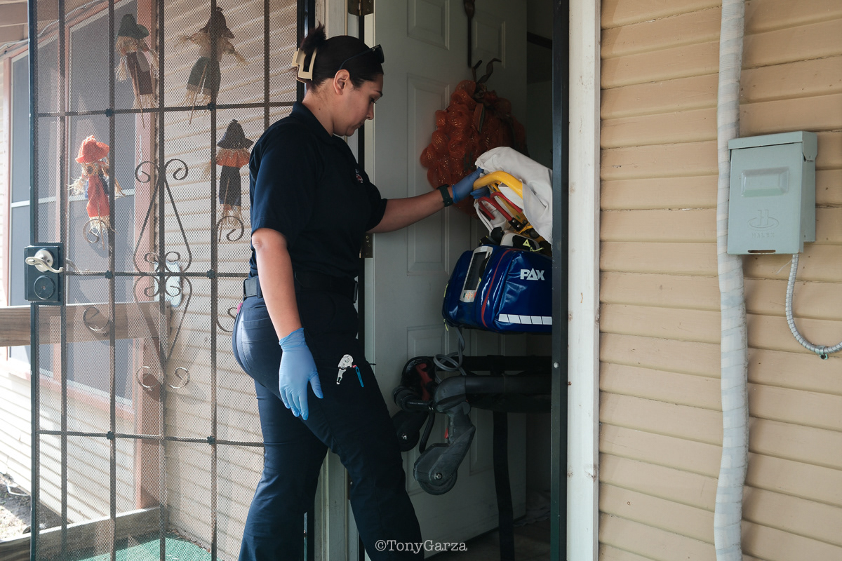 (Pictured: Supervisor/Paramedic O. Espinoza, with over 20 years of service, walking in and out from emergencies.)