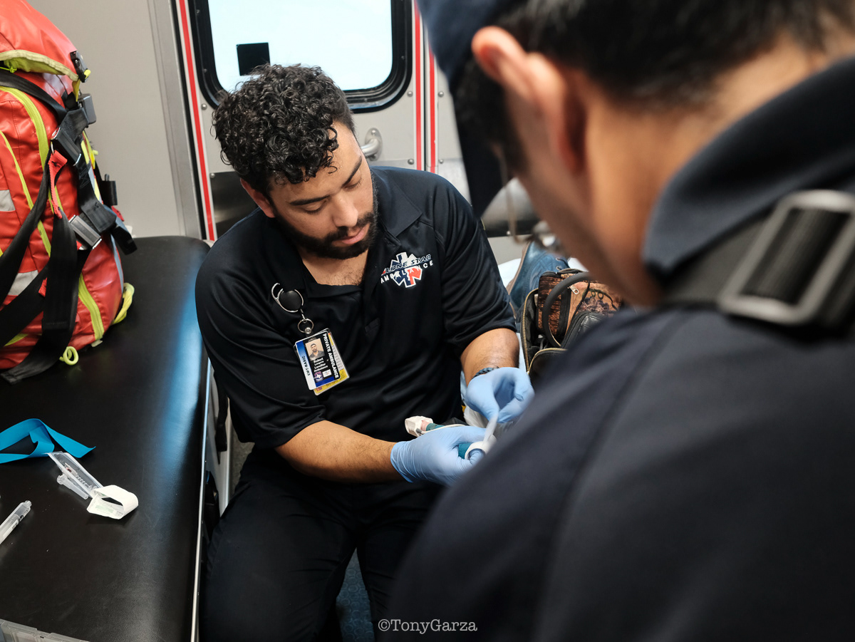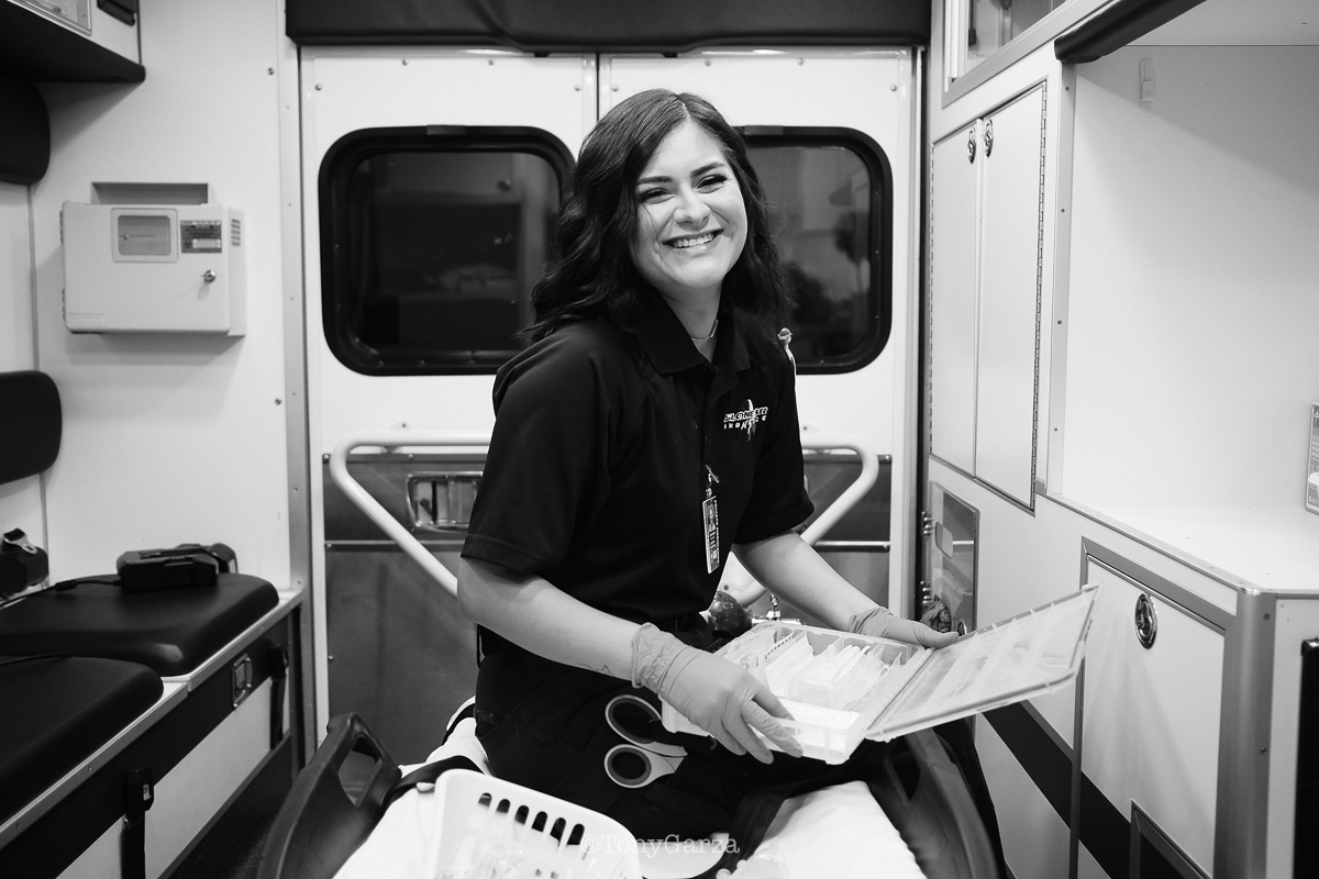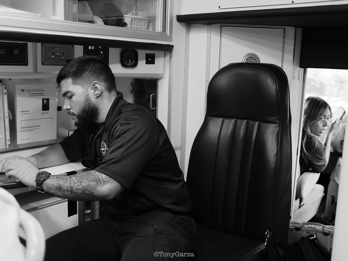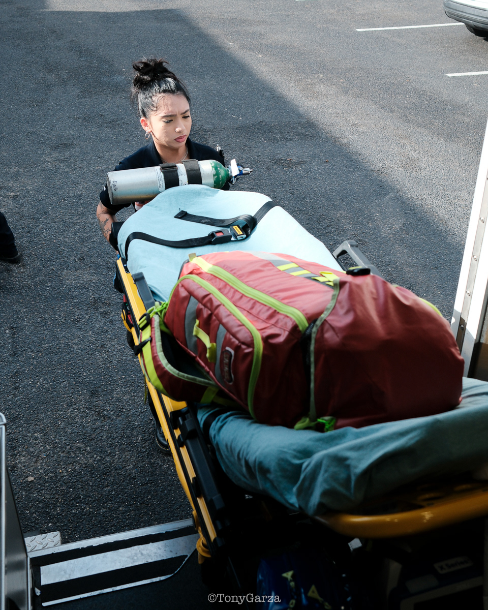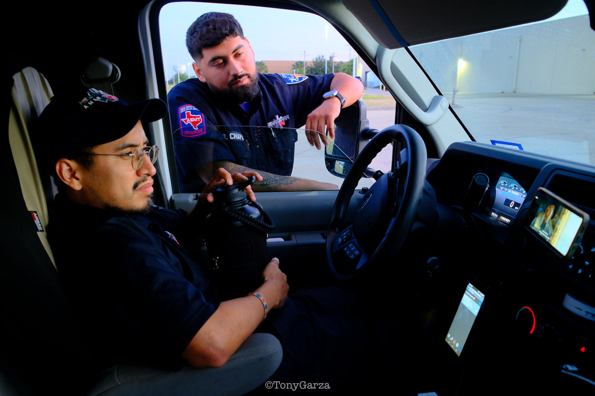 Alpha 3: Paramedic R. Maciel (11 years) and EMT L. Ramirez (5 years), on a 12-hour shift, both joined EMS to get 911 experience and save lives.