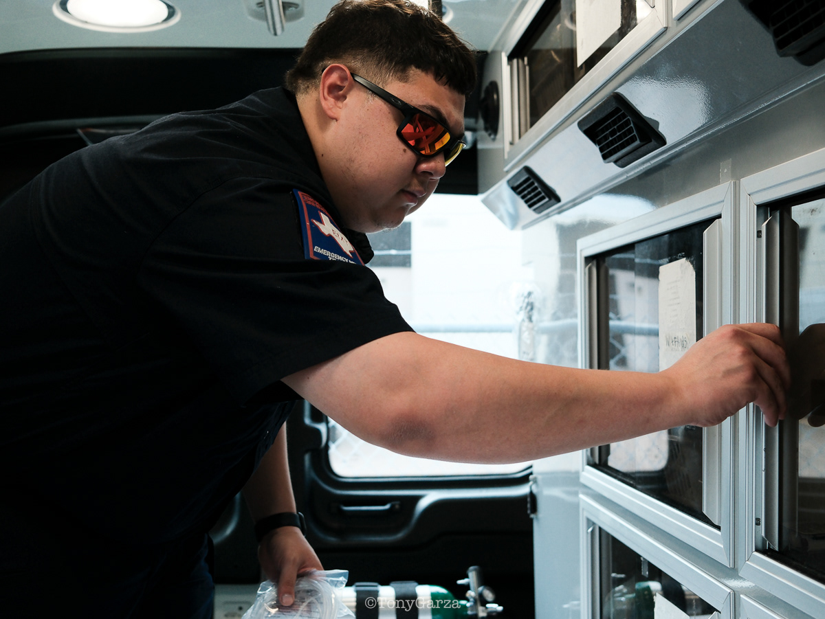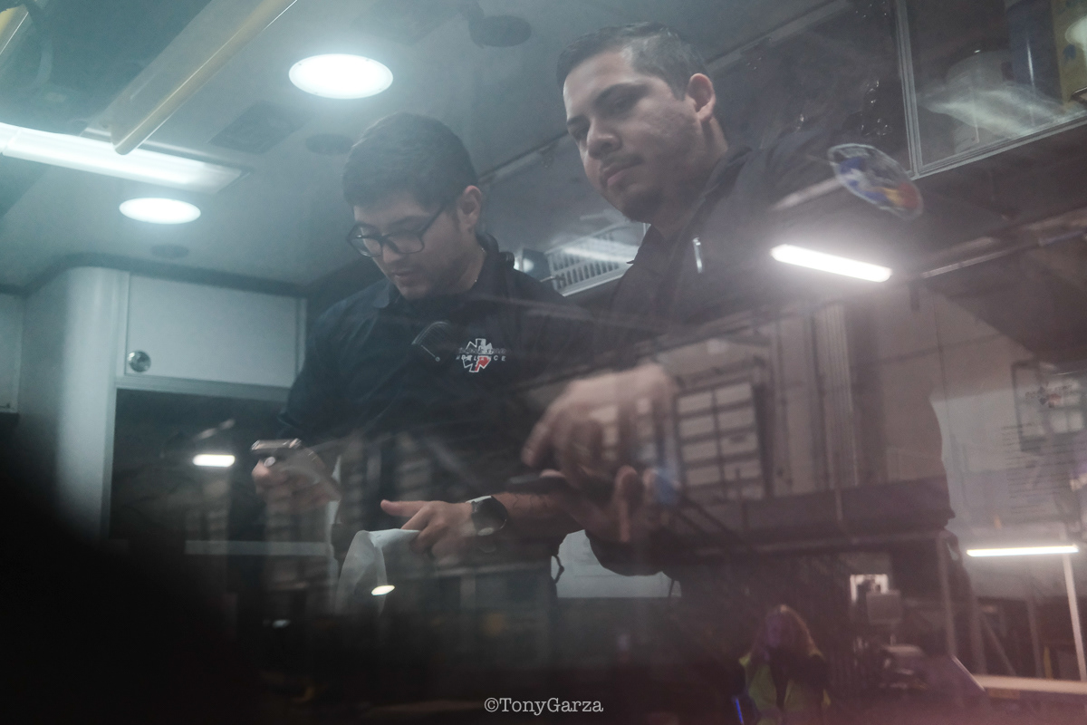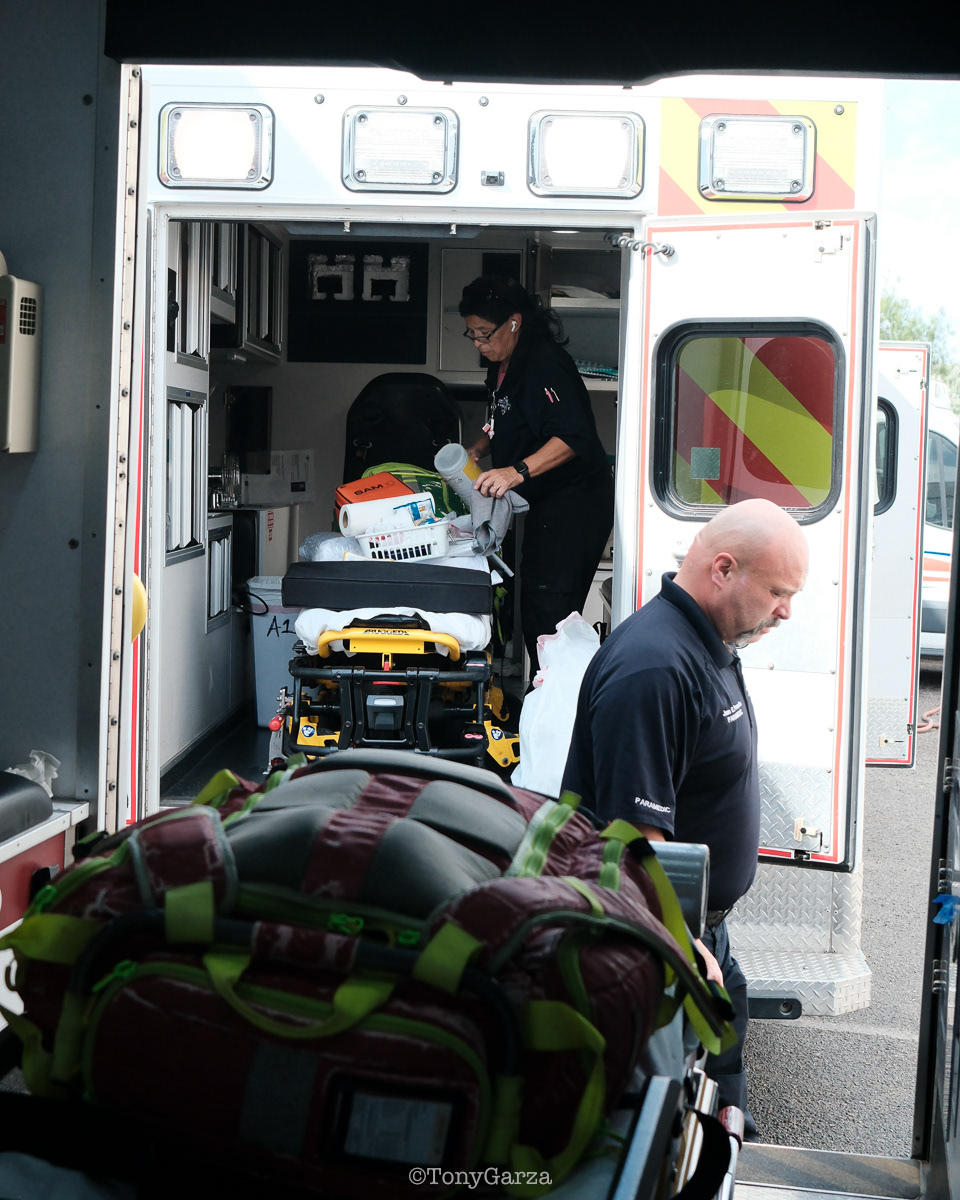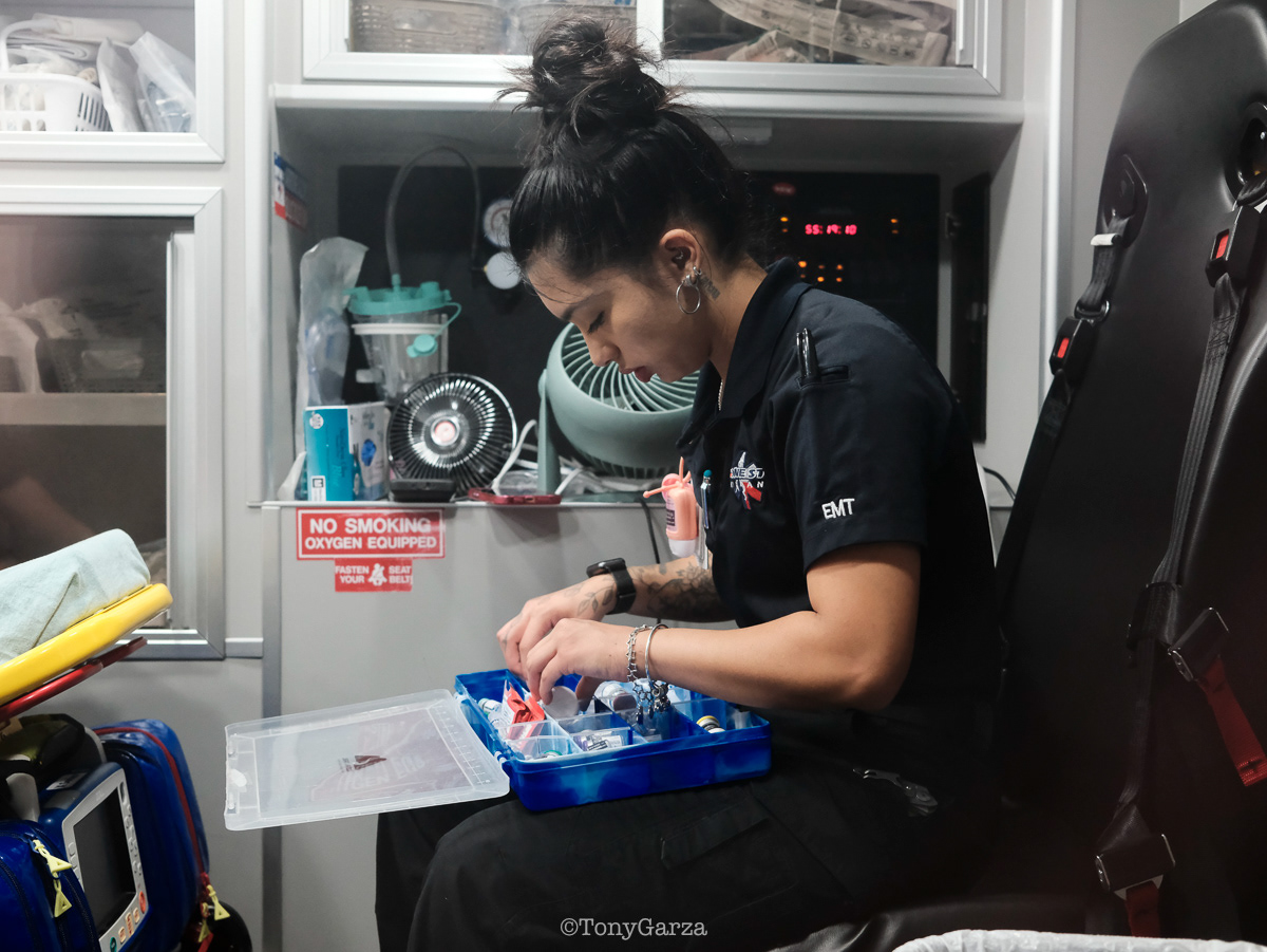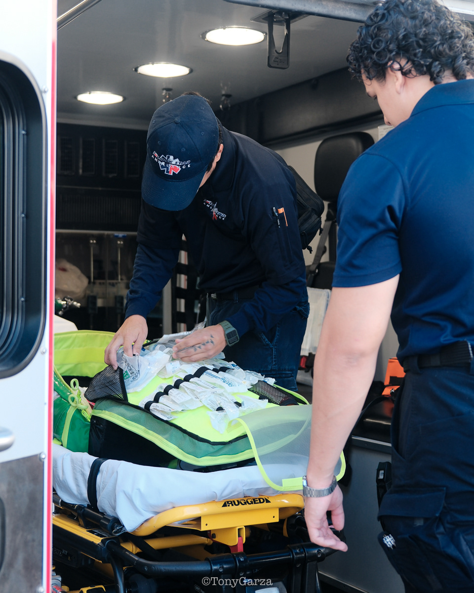 Alpha 3: AEMT J. Hernandez and EMT M. Marquez, on a 12 hour shift, with a combined experience of 22 years.