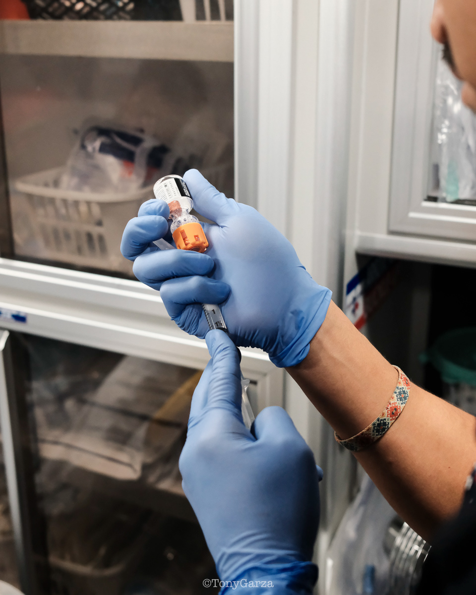 (first photo) Paramedic C. Rodriguez, on Medic 7, prepares antiemetic medication for a stroke patient experiencing slurred speech and nausea. The purpose is to relieve nausea and prevent vomiting that will compromise the airway during a rapid transport to the hospital. In making split-second decisions, field knowledge, experience, and foresight are critical.