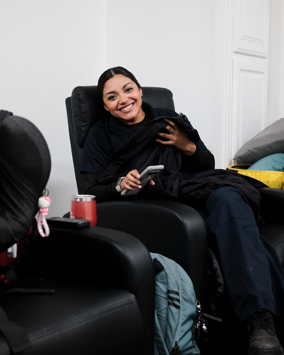 EMT Y. Lopez enters the station carrying her backpack and lunch bag to begin her 24-hour shift.