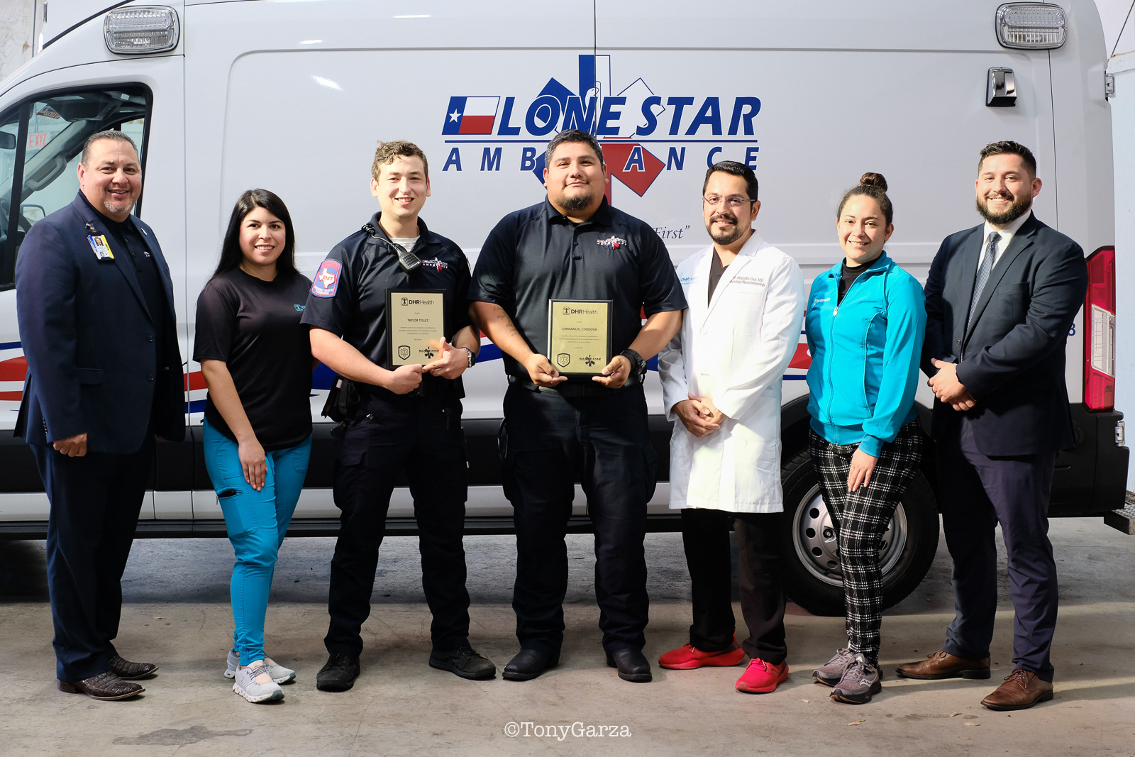 Doctor Robert Alejandro Cruz, along with DHR Health Neurology Department, present Lone Star Ambulance Paramedic E. Cordova, and EMT T. Tellez, with an award for their heroic act of helping and getting a stroke patient to the hospital. The patient received treatment in the appropriate time frame to have a full recovery.