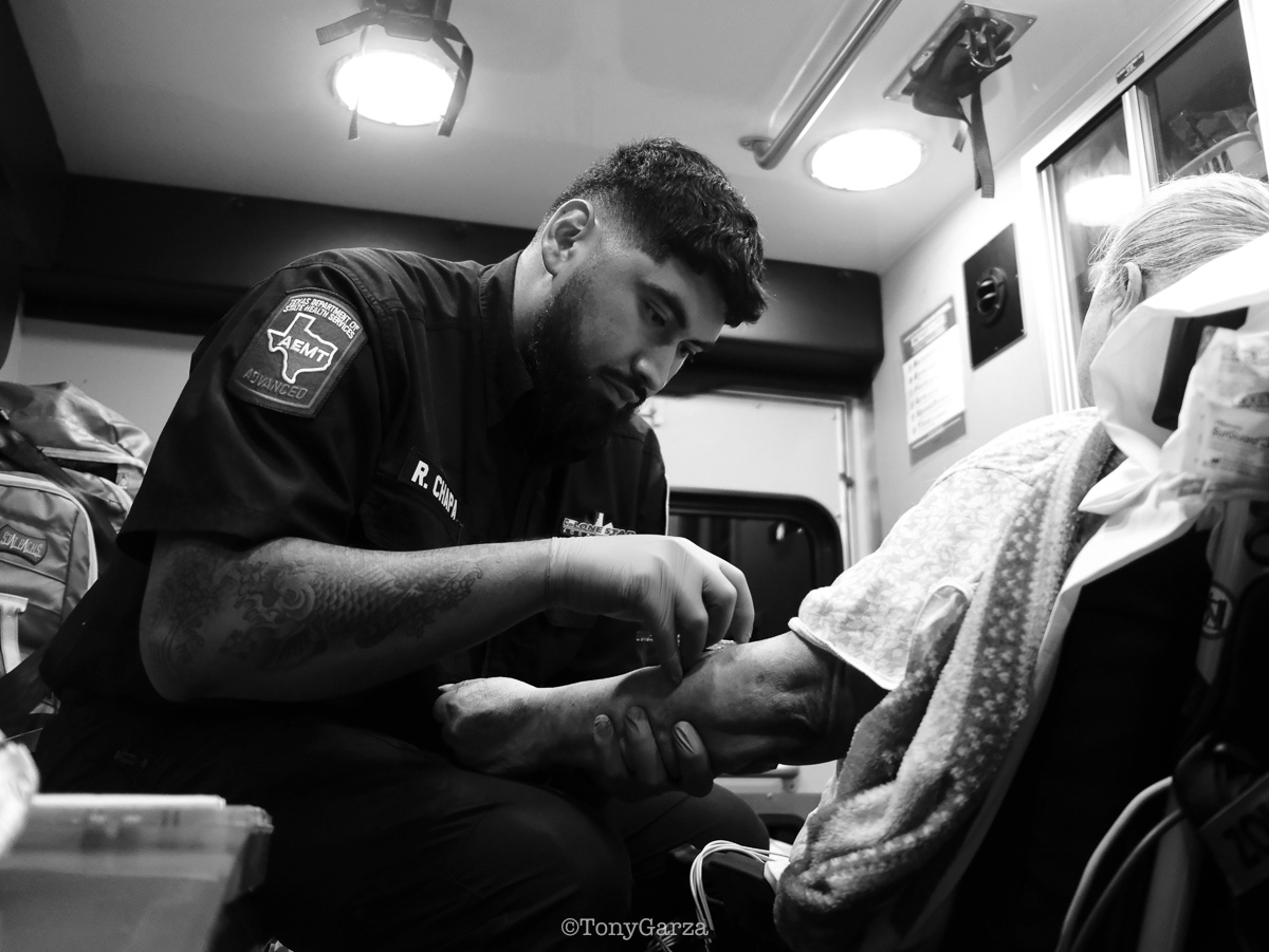 The Spark of Knowledge: Guided by seasoned paramedics, new medics learn emergency care as they enter and work in the field—a full-circle moment every medic experiences. Such mentorship is both a professional and ethical duty—essential and sacred. Its purpose is to pass knowledge from one generation to the next so the profession can advance, the highest standards of care are maintained, life is protected, and, above all, harm is avoided. All of this is possible only if the new generation understands and carries these principles forward. In this moment, the seasoned medic hands a filled NS syringe to the trainee, guiding them to complete the IV procedure—a spark of knowledge that creates a spark of life for the patient.